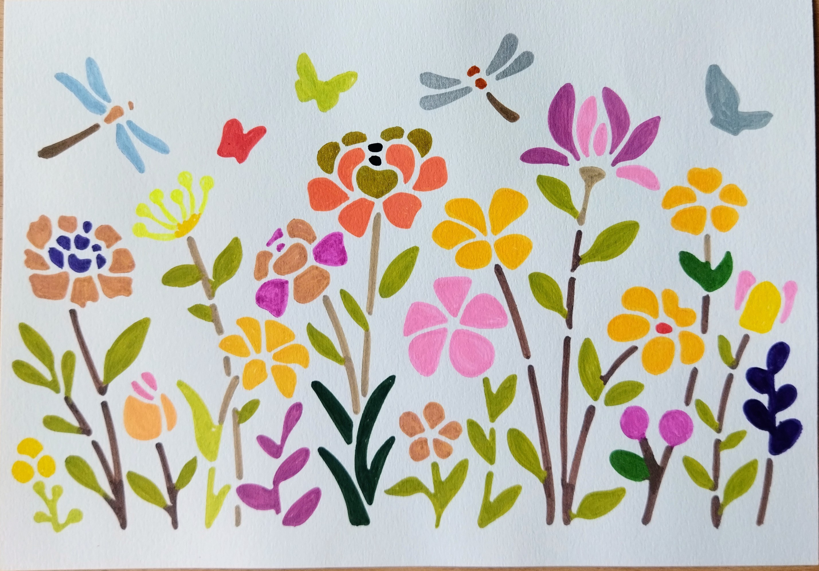 Pour cette illustration, j’ai travaillé avec des feutres professionnels et de la peinture gouache, afin d’obtenir des couleurs franches et lumineuses. Les fleurs stylisées se mêlent aux feuillages, tandis que libellules et papillons semblent voler doucement au-dessus de ce jardin imaginaire.