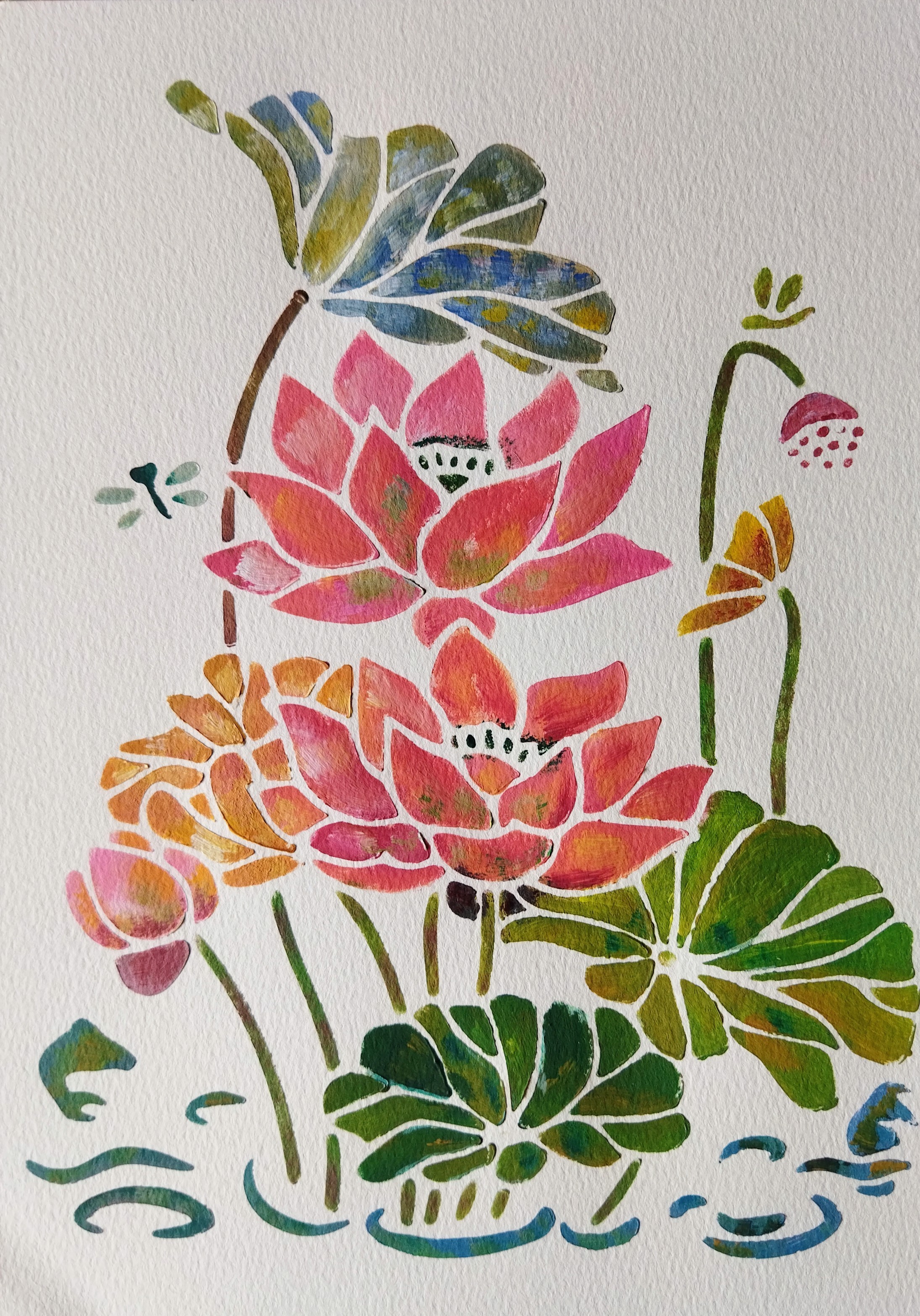 Avec « Lotus du Jardin Secret », j’ai voulu représenter un moment calme et poétique inspiré des jardins d’eau. Les fleurs de lotus s’élèvent doucement au-dessus du bassin, entourées de feuilles aquatiques et de petites formes végétales qui évoquent un paysage paisible.