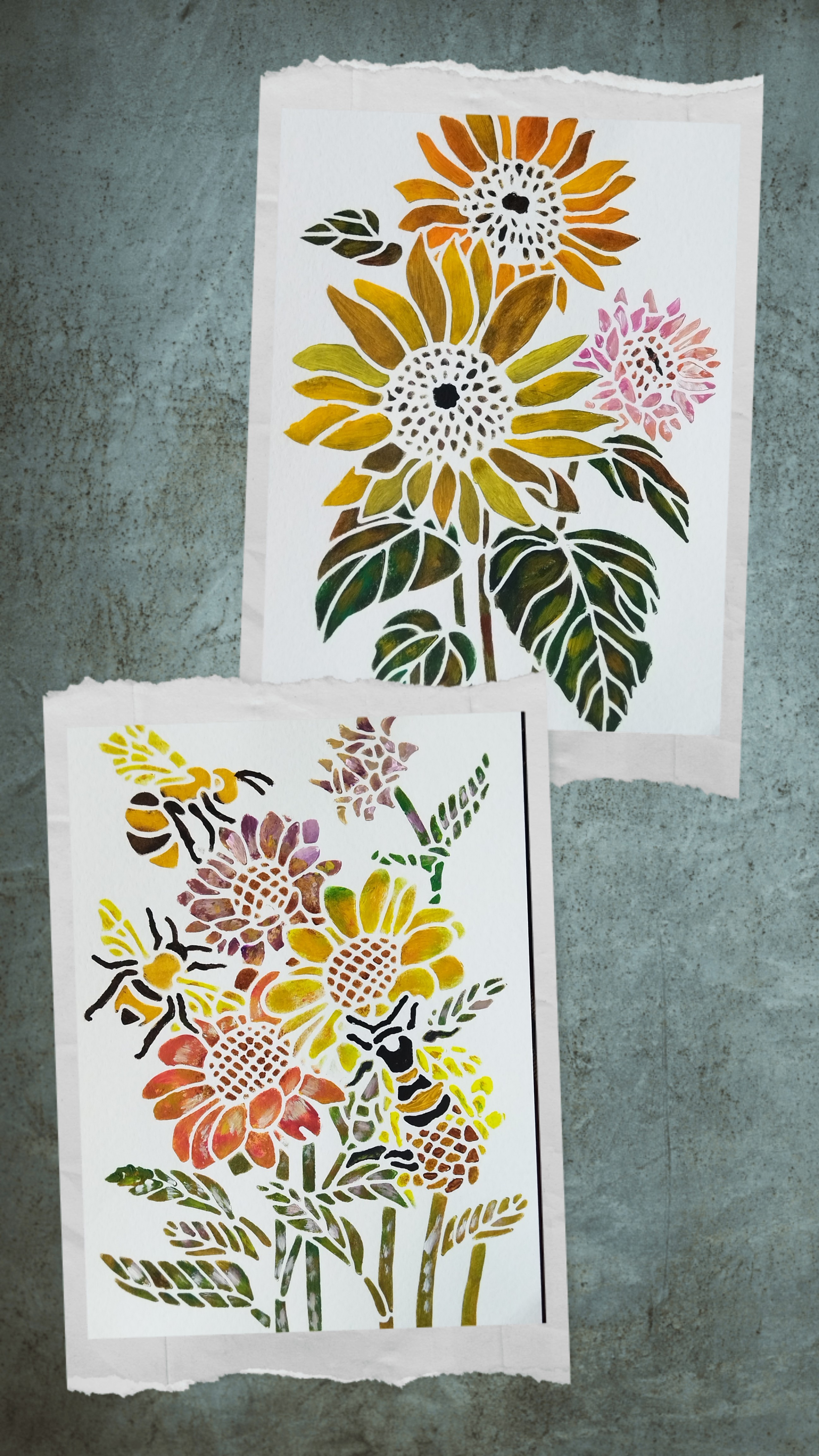 Je réalise mes illustrations au pochoir avec de la peinture gouache, une technique qui me permet de jouer avec les textures, les transparences et les nuances de couleurs. Les pétales jaunes, orangés et rosés évoquent la chaleur du soleil, tandis que les feuillages verts apportent profondeur et équilibre.