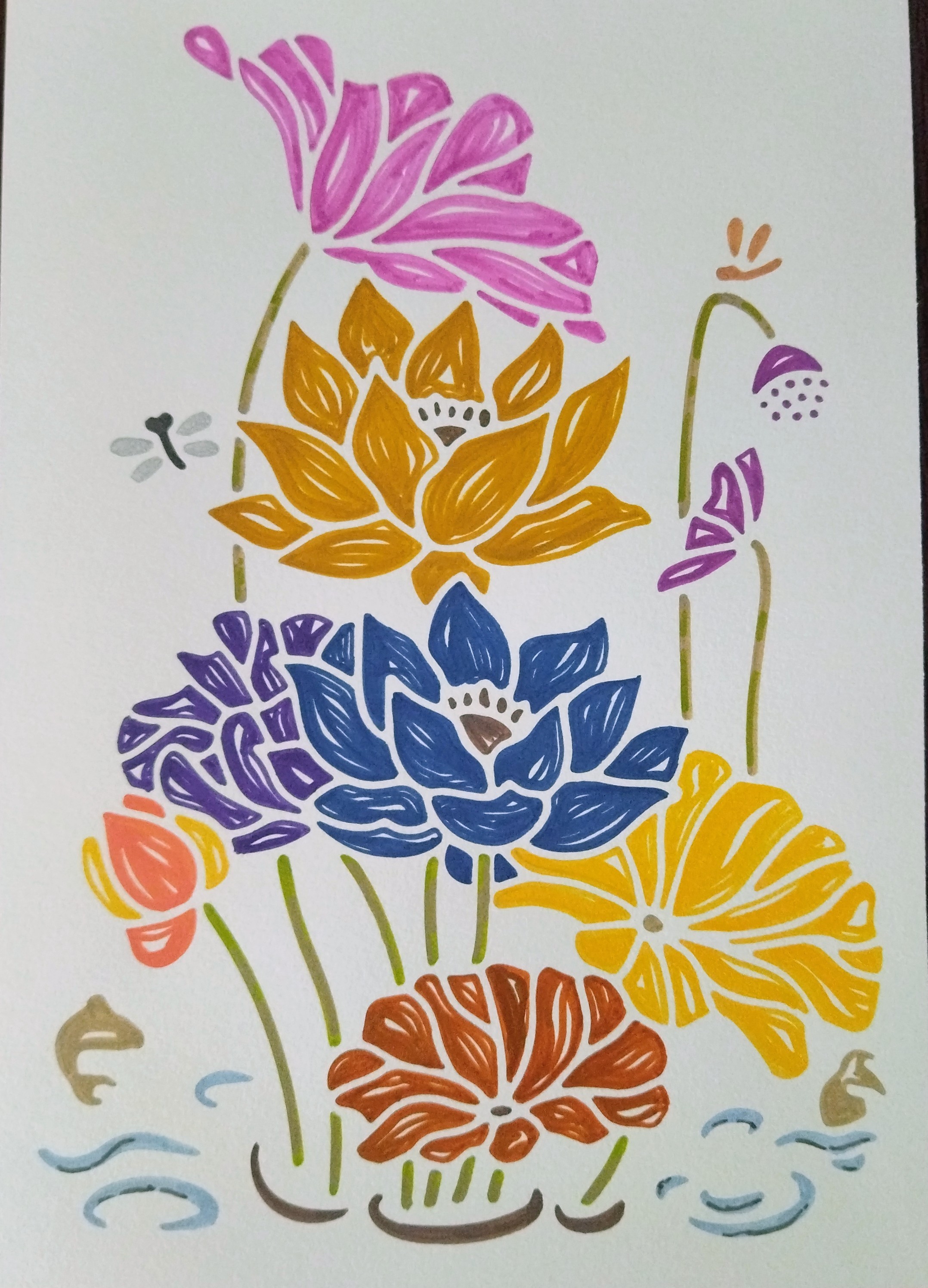 Pour réaliser cette illustration, j’ai travaillé au pochoir avec des feutres professionnels et de la peinture gouache, une technique qui me permet d’obtenir des formes nettes tout en conservant la richesse des nuances. Les pétales se parent de jaune doré, bleu profond, rose et violet, tandis que l’eau et les feuillages apportent douceur et équilibre à la scène.