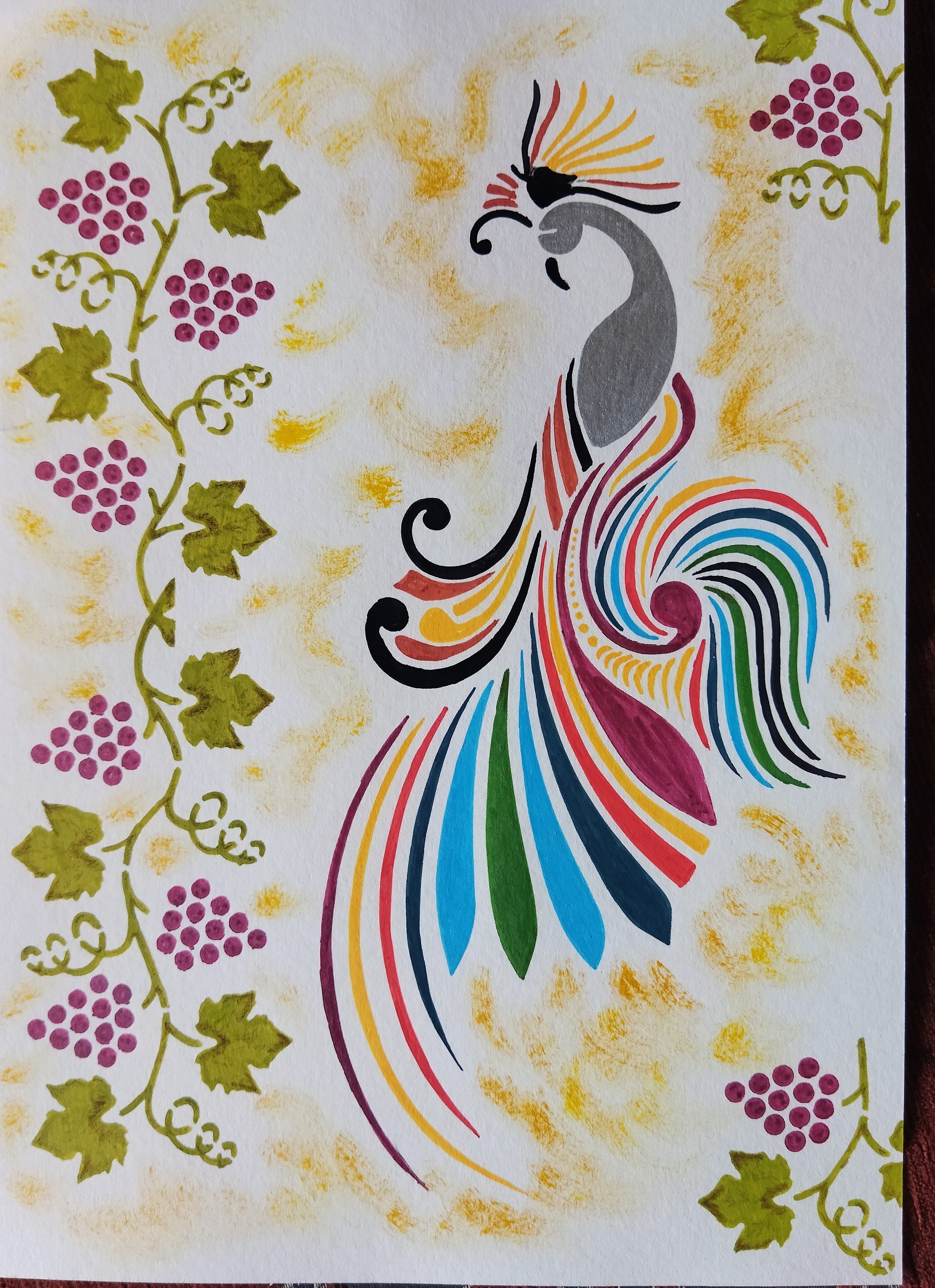 - Motifs : paon stylisé, plumes colorées, vigne et grappes de raisin