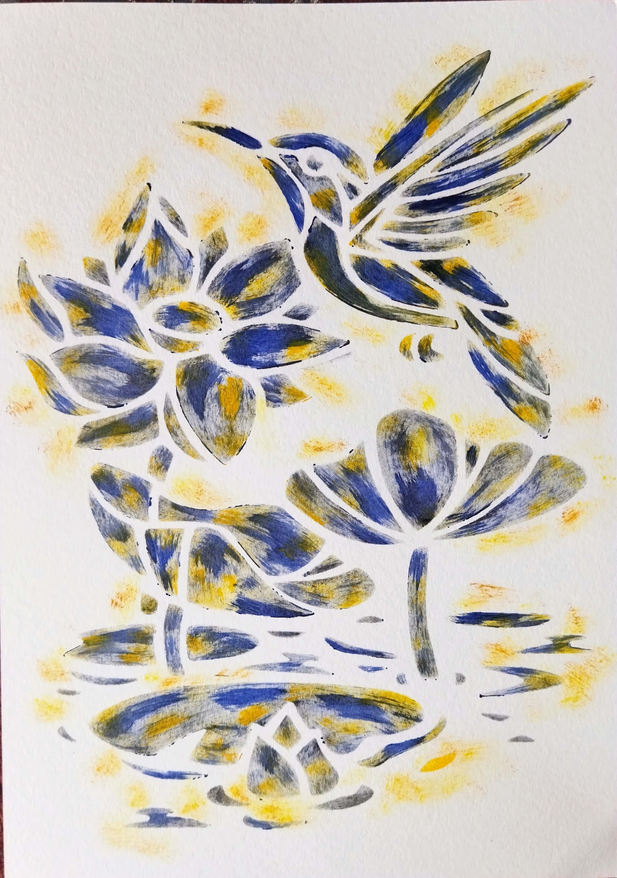 Colibri et Lotus Nocturnes – Illustration pochoir florale et oiseau – Œuvre originale Maison Brigitte