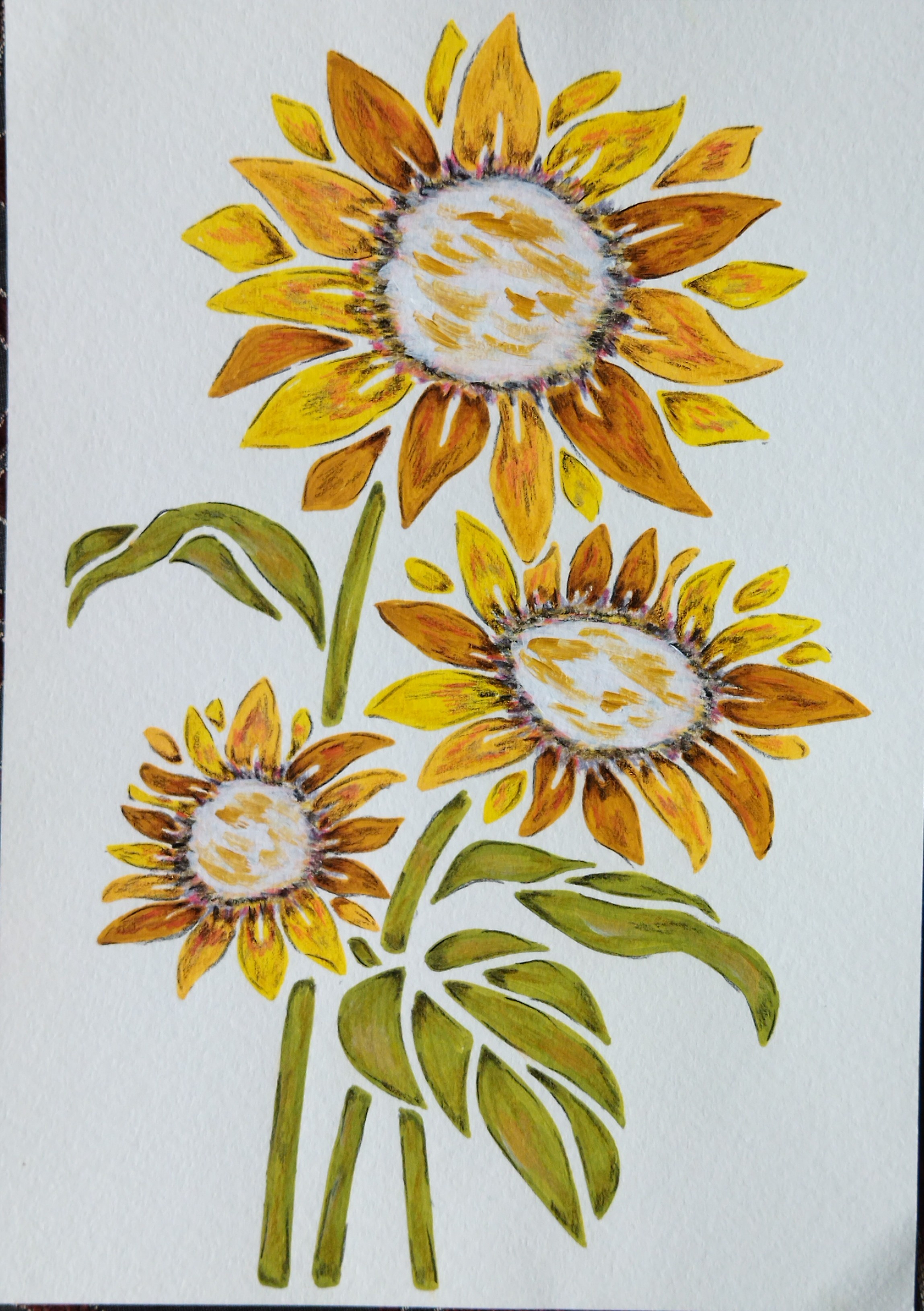 J’ai représenté trois tournesols lumineux, ouverts comme de petits soleils. Leurs pétales dorés et orangés rayonnent autour d’un cœur clair, tandis que les tiges et les feuilles vertes apportent équilibre et mouvement à la composition.