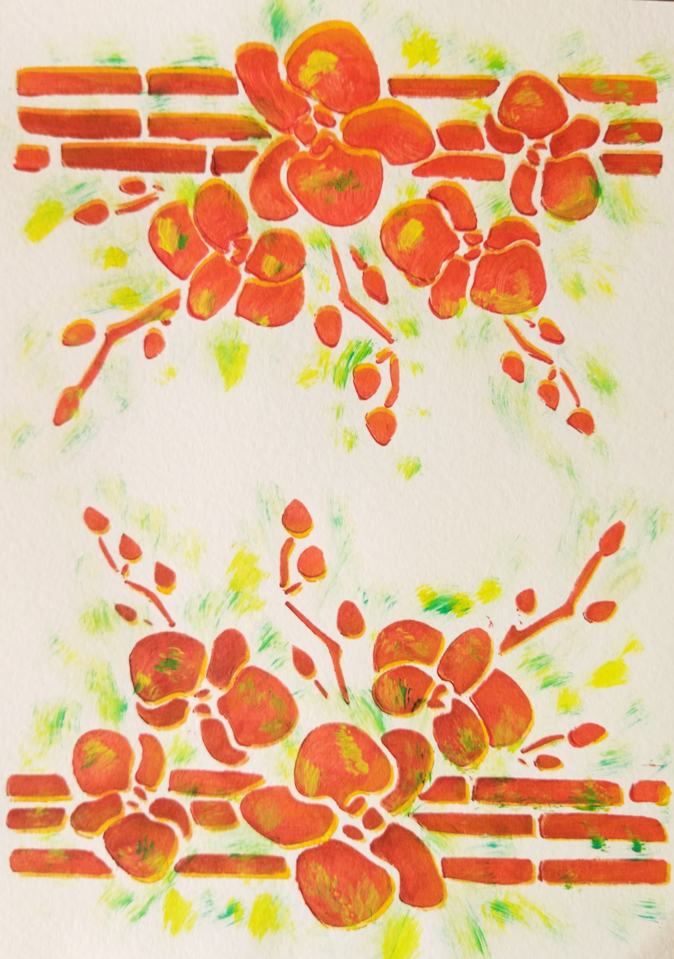 Des fleurs rouges et orangées semblent s’épanouir et grimper le long d’un mur stylisé. Les branches fines et les petites fleurs évoquent une végétation libre, presque sauvage, qui trouve sa place dans la chaleur de la pierre.